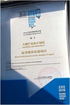 2013年10月24日下午,大黃鴨北京告別會暨“為愛而設計”公益活動頒獎典禮在頤和園舉行。設計周組委會向今年北京國際設計周期間表現卓越的機構與設計師頒發獎項,廣安控股大柵欄投資有限責任公司榮獲北京國際設計周戰略合作平臺獎,大柵欄更新計劃獲得2013北京國際設計周最受媒體歡迎獎,大柵欄領航員計劃中微胡同、老張的年畫、一勺子糖、胡同廁所等諸多項目分別獲獎。
